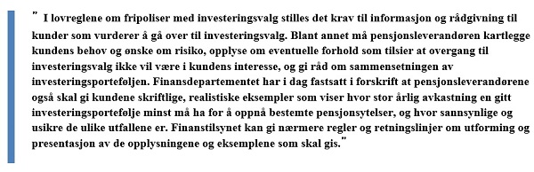 Utover dette har en samlet finansnæring laget retningsregler for rådgivingen. Alt dette kommer i tillegg til de alminnelige regler for rådgivning, informasjon og dokumentasjon vi ellers har ovenfor kunder. Selvsagt er det mye overlapp, men en av utfordringene har likevel blitt å systematisere disse mange krav på en slik måte at kunden faktisk tilegner seg nødvendig informasjon, forstår den og gjør det valg som er riktig for den enkelte.