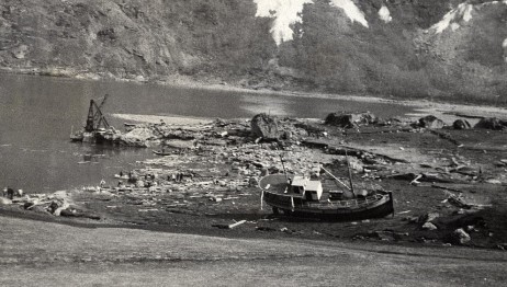Skadene i Tafjord etter flodbølgen i Tafjord 1934. Foto fra Furseth (1985, øverst); spbekeil /Scanpix (nederst).