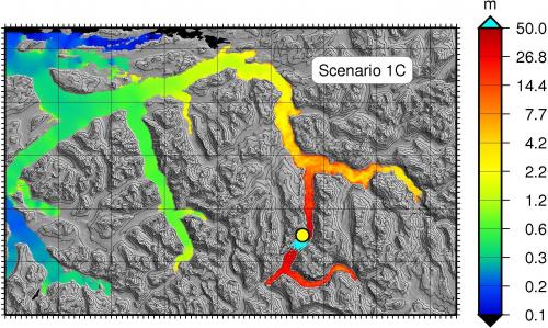 Eksempler på regionalt faresonekart (øverst) og detaljert lokal analyse for Hellesylt (nederst) for scenario 1C (54 millioner kubikkmeter; nominell årlig sannsynlighet mellom 1:1000 og 1:5000). NGI.