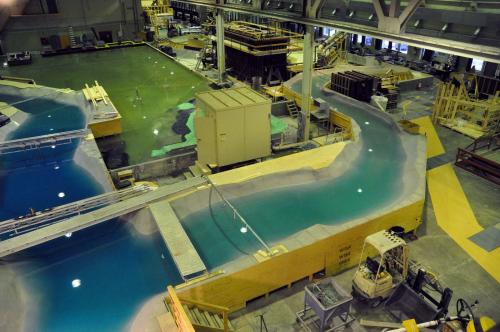 Laboratoriemodell for skred og flodbølger i Storfjorden på Sunnmøre, skala 1:500, ved SINTEF KHL. Foto: NGI.