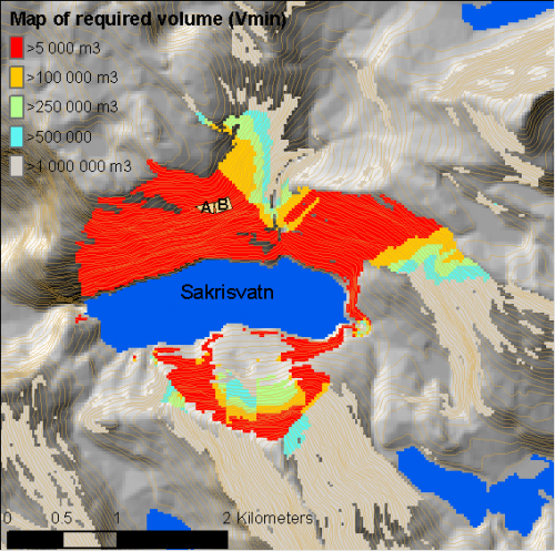 Innsjøer med høy relativ sannsynlighet for fjellskred som ut fra statistiske kriterier kan nå fram til og danne en flodbølge i hver av innsjøene (øverst). Eksempel på kart som viser det minste volum som skal til for at et fjellskred ut fra en statistisk sammenheng mellom volum og utløpsdistanse kan nå fram til Sakrisvatn, Norddal (nederst). Omarbeidet fra Romstad m.fl., 2009.
