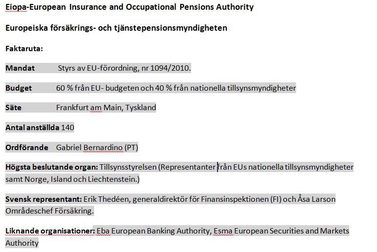 Eiopa är således en viktig myndighet för försäkringstillsynen och försäkringsbranschen. EU-kommissionen kommer under 2017 att göra en översyn av Eiopa, Esma , Eba samt ESRB. Syftet är att bedöma hur systemet fungerat hittills och hur det ska se ut i framtiden.