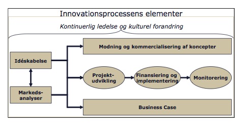 En succesfuld styring af innovationsprocessenkræver mangeartede kompetencer i formaf ledelsesfokus, idéudvikling, markedsindsigt,forsikringsforståelse, projektledelse,overvågning af Return on Investment samtopfølgning. De elementer, der tilsammendanner grundlaget for at etablere en vækstskabendeinnovationsproces, er skitseret i figurenpå næste sida.