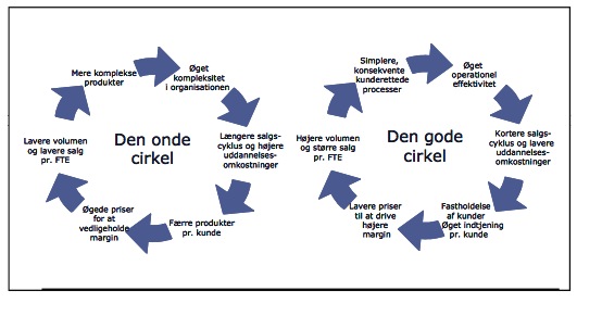 En snæver opfattelse af innovation er årsagtil, at innovationsprojekter ofte ender i denonde cirkel, hvor nye idéer komplicerer forretningssystemeti stedet for at berige det;Gennem produkt-orienteret innovation udviklesprodukter, der i kraft af høje udviklingsomkostningerog høj kompleksitet påvirkerprofitabiliteten negativt. Det bunder dels ikundernes manglende forståelse af produktet,og dels i de relaterede systemer og processer,der i kraft af deres kompleksitet bliver enhæmsko for organisationen. Særligt i forsikringsbranchenhar implementeringen af enrække nye systemer og processer faktisk oftemedvirket til at reducere virksomhedens evnetil hurtig omstilling. I forsøg på at genvindekunder og profitabilitet udvikles efterfølgendenye produkter og systemer, der blot forværrersituationen. Dette er typiske karakteristikafor den onde innovationscirkel.