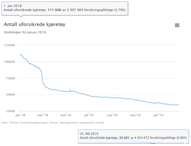 Som figuren over viser, har det vært en markant og gledelig nedgang i antall uforsikrede kjøretøy fra januar 2018.