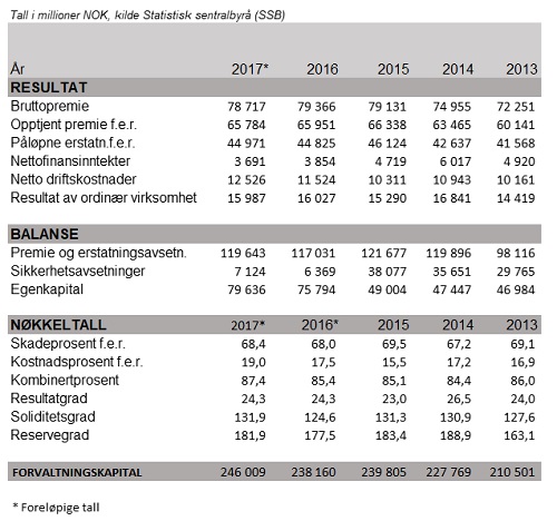 Foreløpig resultat i norske skadeforsikringsselskaper viser et samlet overskudd på litt under 16 milliarder kroner før skattekostnad for 2017. Dette er et resultat på samme nivå som året før. Det forsikringstekniske resultatet anses som godt med en kombinertprosent på 87 (sum av skadeprosent og kostnadsprosent). Dette skyldes at forsikringsselskapene fortsatt har fokus på effektiv drift og dynamisk prising. De siste tre årene har premievolumet vært relativt stabilt og fra 2016 til 2017 er bruttopremien blitt redusert med 1 prosent. Sterk konkurranse og stabil skadeutvikling er hovedårsaken til denne utviklingen.