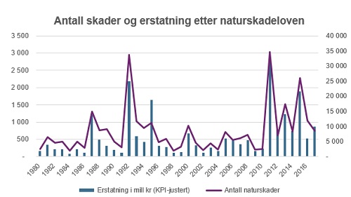 I 2017 var det et gunstig år med få store hendelser. Samlet erstatning i 2017 ble på 875 millioner kr. Dette er bare halvparten av hva som inntraff for to år siden. Det var en del nedbør i oktober på sørlandsområdet som samlet medførte erstatninger for drøyt 400 millioner kr under naturskadepoolen. Av figuren nedenfor ser en helt klart at det er store variasjoner fra år til år. Noen år skiller seg ut med store erstatninger etter alvorlige hendelser; slik som i 1992 (nyttårsstorm), i 1995 (flom Glomma og Lågen), i 2011 med storm (Dagmar og Berit) og stormen Nina i 2015.