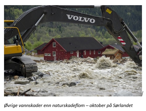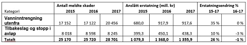I 2017 var det særlig to dager i oktober hvor det regnet ekstra mye på Sørlandet, og da særlig rundt Kristiansand. Disse nedbørsskadene forårsaket noen flom- og skredskader som dekkes under naturskadepoolen (se graf over), mens overflatevann, tilbakeslag og stopp i avløp, dekkes under de ordinære vannskadene. I tabellen under vises disse vannskadene. En ser der at erstatningsbeløpene i 2017 som i 2016 ble på nesten 1,4 milliarder. I 2016 var det et voldsomt regnskyll 6.august på Østlandet, mens det i 2017 var flere hendelser på høsten og da spesielt på Sørlandet i oktober.