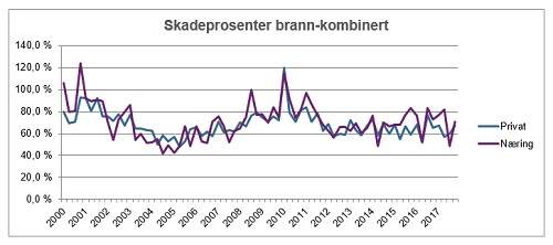 I figuren nedenfor er forholdet mellom erstatningsbeløp og premie vist på private boliger og innbo, og for næringsbygg, kvartalsfordelt fra 2000 og fram til 2017. Siden næringsforsikringer er mer storskadeutsatt enn privat, vil resultatet dermed varierer mer fra periode til periode. Samtidig vil sesongsvingningen være utslagsgivende. Om vinteren kan frostperioder innvirke på både brann og vann.
