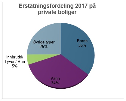 Av figuren over ser en at brannskadeerstatningene utgjør hovedtyngden i 2017, mens vannskadene betydde noe mindre. I 2017 var erstatning etter brann på rundt 2,54 milliarder kr, mot vannskadene som ble erstattet med rundt 2,46 milliarder kr. I gruppen øvrige skadetyper er det rettshjelp, ansvar, kaskoskader, matvarer i fryser og sanitærporselen.