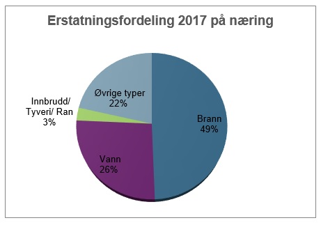 På næring kan innslaget av storskader variere en del fra år til år. I 2017 var erstatningene på 5,25 milliarder kr, nesten 3 prosent lavere enn erstatningene i 2016. Dette til tross for at brannerstatningene økte med 204 mill. kr fra året før, noe som blant annet skyldes et par større branner på et industrianlegg i april 2017. I figuren nedenfor vises det at brannskadene utgjør hovedtyngden med et erstatningsbeløp på 2,6 milliarder kr, mens vannskadeerstatningene utgjør 1,4 milliarder kr.
