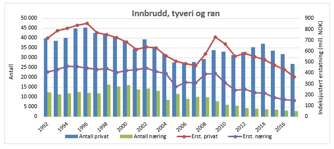 I figuren nedenfor vises utviklingen fra 1992 fram til 2017 i antall skader og erstatning etter tyveri, innbrudd og ran innen private boliger og næringsbygg. Som en ser av figuren har antallet vært nedadgående siden 2009. Det gjelder særlig innen næringsbygg, som også omfatter butikker. Noe av nedgangen på næringsbygg kan skyldes bedre sikringstiltak i form av alarmer og fysiske stengsler.