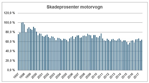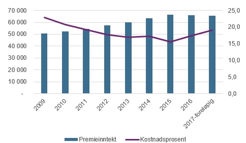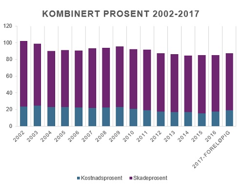 Kombinertprosenten (sum av skadeprosent og kostnadsprosent) i 2017 ble noe høyere enn i 2016, med en kostnadsprosent på 19 og skadeprosent som i 2016 på 68. Driftskostnadene økte noe mer enn premien. En mulig forklaring kan være økt grad av digitalisering med dyrere arbeidskraft og derigjennom økte kostnader. Det har videre vært nedgang i premienivået som kan begrunnes med god lønnsomhet og sterk konkurranse i markedet.