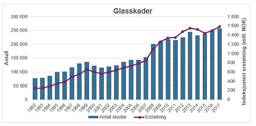 Glasskadene utgjør et betydelig volum, og omfanget har økt de siste årene. Dette kan ha sammenheng med at nyere biler har ruter med mer avansert teknologi som gjør det dyrere å skifte ut.