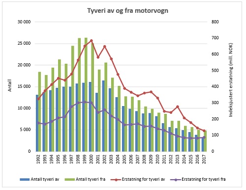 Tyveri av og fra bil utgjør en stadig mindre andel av de totale erstatningene, noe som naturlig følger av sikrere biler, blant annet at nye personbiler har startsperre og kodet nøkkel. For ti år siden utgjorde erstatning etter biltyverier 4 prosent av totale motorvognerstatninger, mens de i 2017 bare utgjorde litt over 1 prosent av de samlede erstatningene på 13,9 milliarder kr. De siste ti årene har også hatt en betydelig nedgang i antall stjålne kjøretøy, fra 9 300 kjøretøy i året til 3 150 stjålet kjøretøy i 2017. Tilsvarende reduksjon har det vært i antall tyverier fra kjøretøy. For ti år siden ble det meldt inn rundt 12 000 slike skader, mens det i 2017 ble meldt 4 900 slike tyverier. Se figuren nedenfor som viser utviklingen siden 1992 og fram til 2017. Tyveri av og fra bil er det færre og færre av, mens erstatningsbeløpet etter tyveri fra bil økte fra 2016 til 2017. Dette kan skyldes mer selektive tyver. Denne erstatningsposten utgjør likevel bare 0,6 prosent av totalen på motorvogn.
