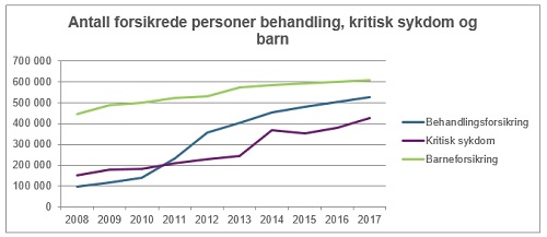I de seneste årene har barneforsikringer, forsikringer av kritisk sykdom og behandlingsforsikringer vært markedsområder i vekst. Av figuren nedenfor ser en at antall forsikrede barn har stabilisert seg, mens antall forsikrede med behandlingsforsikringer fortsatt øker betydelig. Det er bedriftene som hovedsakelig tegner behandlingsforsikring for sine ansatte.