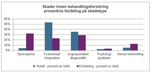 Det kan være noe varierende dekningsomfang fra ett forsikringsselskap til et annet, men hovedsakelig er det operasjoner, samt diagnostikk og fysioterapi/kiropraktikk som står for den største andelen av erstatningskostnadene for behandlingsforsikring. Samlet erstatningsbeløp i 2017 var på nesten 982 millioner kr. Når det gjelder antall skadetilfeller, er de fleste av typen fysioterapi, mens diagnoseutredning og operasjoner er det færre tilfeller av. Se figuren nedenfor.