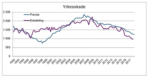 Premienivået innen yrkesskadeforsikring har de siste ti årene blitt redusert i gjennomsnitt, men det kan selvsagt være store forskjeller innenfor de forskjellige yrkesgruppene. I figuren nedenfor vises utvikling av premie og erstatning per forsikret årsverk. Både premiene og erstatningene er justert med G-utvikling (grunnbeløpet i Folketrygden).