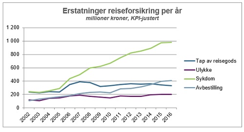 I figuren over vises utviklingen av erstatninger etter reiseskader fra 2002 fram til 2017. Erstatningene er justert til dagens verdi ut fra KPI (konsumprisindeksen). Erstatninger etter reisesykdom har vist en eksplosjonsartet økning fra 2004. Dette skyldes at flere oppsøker fjerne reisemål der risikoen for skader er høyere og som kan medføre lang og dyr hjemtransport. Samtidig er det stadig flere eldre som reiser utenlands. I 2017 ble reisesykdommer redusert med nesten 1 prosent i antall og nesten 2 prosent i erstatning i forhold til 2016. Et område som økte i perioden 2005 til 2007, var tyveri og tap av reisegods, men her ser en at erstatning har stabilisert seg fra 2009 og fram til i dag.