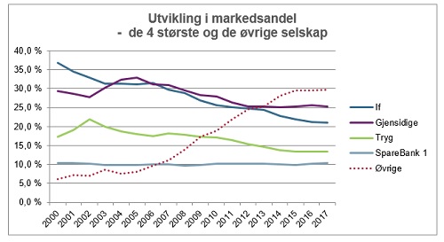 Konkurransen innen skadeforsikring er fortsatt sterk. De små selskapene har tatt markedsandeler fra de største de siste årene, men ser nå ut til å stabilisere seg. I 2017 har de små selskapenes markedsandel på til sammen 29,8 prosent. Til sammen er det 30 selskaper som rapporterer til Finans Norges markedsstatistikk nå.
