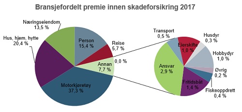 For landbasert forsikring er premien ved utløpet av 2017 på 56,7 milliarder kr, og fordeler seg på hovedbransjene slik figuren over viser. Motorvognforsikring utgjør hele 37 prosent. Motorvogn omfatter alle typer kjøretøy slik som personbiler, lastebiler, busser, traktor, arbeidsmaskin og motorsykler. Personrelaterte skadeforsikringsprodukter står for 15 prosent av premieinntektene. Disse produktene gjelder lovpålagt yrkesskadeforsikring, utover lov om yrkesskade (trygghetsforsikring), ulykkesforsikringer, barneforsikring, kritisk sykdom og behandlingsforsikring.