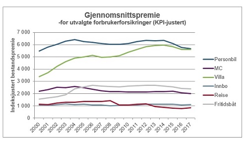 Av figuren nedenfor ser en at prisen på de vanligste forbrukerforsikringene de siste årene har holdt seg ganske stabile når prisene KPI-justeres. Dette skyldes hovedsakelig sterk konkurranse og mer gunstig skadebilde. Prisen på en forsikring for den enkelte kunde vil selvsagt variere med mange faktorer som ikke framkommer av dette bildet.