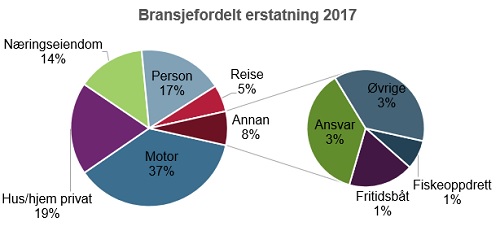 Figuren nedenfor viser bransjefordelt bruttoerstatning i 2017 innenfor landbasert skadeforsikring. Totale erstatninger (eksklusive naturskader) var på 37,6 milliarder kr, hvor hovedtyngden av erstatningene er på motorvogn med 13,9 milliarder kr.