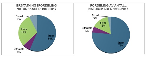 Norsk Naturskadepool er en skadeutligningspool som er obligatorisk for alle forsikringsselskap som tegner brannforsikring av bygninger og innbo i Norge. Skadetypene som dekkes under denne ordningen er storm, stormflo, flom, skred og jordskjelv og vulkanutbrudd. Ordningen har stort sett vært uforandret siden 1980 og figuren nedenfor viser at det totalt i perioden 1980 til 2017 har vært flest stormskader. Konsekvensen av en flomskade er derimot større enn en storm; 77 prosent av antall naturskader skyldes storm, mens de utgjør bare 56 prosent av erstatningsbeløpet.