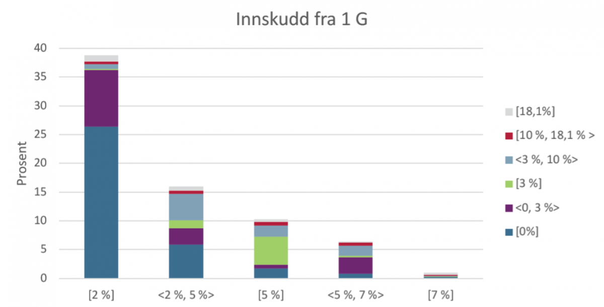Om lag 2,4 prosent av medlemmene i innskuddsordninger var ved utgangen av 2018 med i ordninger med maksimale sparesatser, det vil si ordninger med 7 prosent innskudd fra første krone for lønn opp til 12 G og 18,1 prosent innskudd for lønn mellom 7,1 og 12 G. Dette er en økning på ca. 4 000 flere medlemmer enn året før.