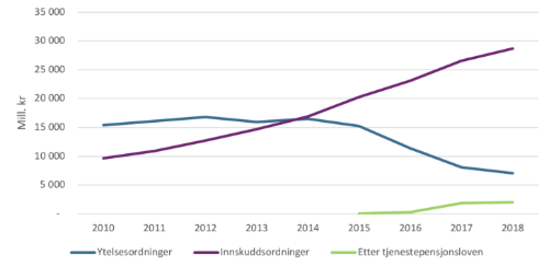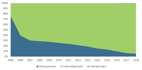 I figuren under vises omfanget av omdanning fra private ytelsesordninger til innskuddsordninger de siste årene.