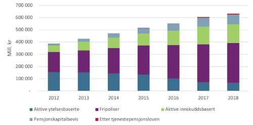 De samlede forsikringsforpliktelsene for tjenestepensjon i privat sektor var ved utgangen av 2018 på 633 milliarder kroner, mot 605 milliarder kroner året før. Dette innebærer en økning på om lag 5 prosent.