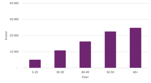 Figuren under viser hvordan gjennomsnittlig sparebeløp fordelte seg mellom de ulike aldersgruppene i 2018.