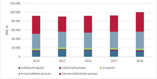 Det ble i 2018 innbetalt i overkant av 100 milliarder kroner til livsforsikrings- og pensjonsprodukter hos medlemmene i Finans Norge. På samme tid i 2017 var innbetalt premie på 93 milliarder kroner. Innbetalinger til tjenestepensjonsavtaler for ansatte i privat og kommunal sektor utgjorde 81 prosent av de samlende premieinnbetalingene, og tilsvarer om lag 82 milliarder kroner.