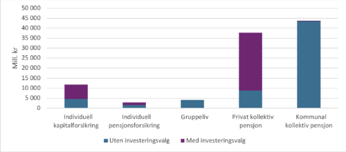Innbetalt premie til livsforsikrings- og pensjonsprodukter er i økende grad knyttet til avtaler med investeringsvalg. I 2010 utgjorde innbetalt premie til produkter med investeringsvalg 21 prosent, mens innbetaling til slike produkter ved utgangen av 2018 sto for 37 prosent av den totale premien. Det er særlig innbetalinger til private tjenestepensjonsordninger med investeringsvalg som trekker opp denne andelen. Ved utgangen av 2018 var 77 prosent av innbetalt premie til private tjenestepensjonsordninger knyttet til avtaler med investeringsvalg.