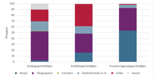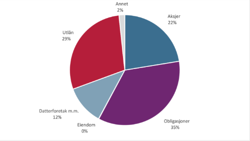 Det fremkommer i figuren under hvordan den samlede forvaltningskapitalen fordelte seg mellom ulike aktivaklasser i 2018. Eiendom ligger hovedsakelig i kategorien «Datterforetak med mer».