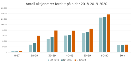I Norge utgjør kvinner fortsatt 30 % av investorene i aksjer og aksjefond. Og deres verdier har normalt tilsvart 20 % av verdiene hos privatpersoner. Normalt har de fleste investorene vært over 50 år. Men nå ser vi et stort skifte: Av de som investerer på Oslo Børs har antallet økt med 23,4% det siste året. 67 % av disse nye aksjonærene er under 40 år. Kvinner økte 19 % i antall og menn med 26 %. Menns sparevolum er fortsatt høyere enn kvinners. Sparing i aksjer og fond må ansees som sparing uten bindingstid, at investeringene er likvide og lett tilgjengelige, som er drivende faktorer for de mer kortsiktig investorene.