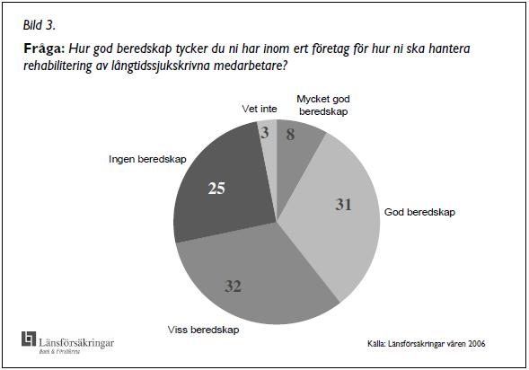 Länsförsäkringar ställde frågor till företag med 1– 49 anställda våren 2006, bl a om hur de såg på sin beredskap att hantera långtidssjukskrivna medarbetare (bild 3). 60 % uppgav att de hade ingen eller bara viss beredskap. Här behöver företagen uppenbarligen stöd och hjälp för att kunna ta sitt ansvar.