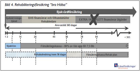 Länsförsäkringar har utvecklat ett koncept kallat braHälsa. Det innehåller f n sjukvårdsförsäkringar i några olika varianter samt en rehabiliteringsförsäkring. Vi arbetar också med olika typer av förebyggande insatser. En beskrivning av hur de olika produkterna samverkar i syfte att åstadkomma en effektiv rehabilitering finns i bild 4.