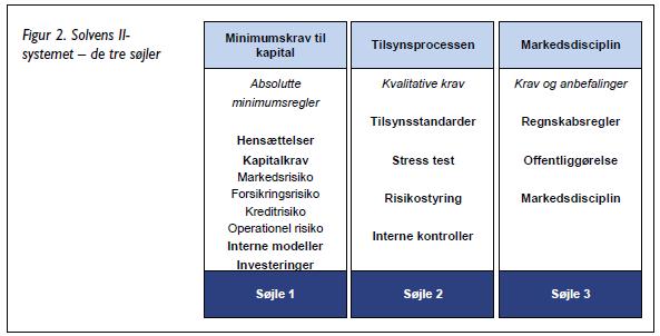 søjler, der alle er med til at definere det samlede solvenstilsyn. De 3 søjler er gengivet i figur 2. I søjle 1 fastlægges de kvantitative solvenskrav, mens der i søjle 2 stilles supplerende krav, der kan være både kvalitative og kvantitative. Når standardmodellen er opbygget på baggrund af et europæisk „gennemsnitsforsikringsselskab“, kan der naturligvis være behov for at stille supplerende krav, og det vil ske i søjle 2. Endelig vedrører søjle 3 regnskabsregler og oplysninger til myndigheder og offentlighed, der kan være med til at øge markedsdisciplinen.