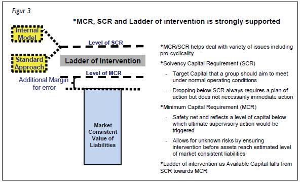 I båndet mellem SCR og MCR er det hensigten, at tilsynsmyndighedernes indgrebsmuligheder gradvist skal skærpes i form af en såkaldt „ladder of intervention“, jf. figur 3. De konkrete trin i denne „stige af indgrebsmuligheder“ kendes foreløbig ikke. Der er næppe heller tvivl om, at der blandt tilsynsmyndighederne i CEIOPS hersker uenighed om, hvor skrapt der skal reageres på brud på SCR. Det er derfor en hårfin balance både at harmonisere myndighedernes reaktioner og at sikre, at „stigen af indgreb“ får så mange trin, at SCR også reelt bliver en blød solvensgrænse, så alene MCR kommer til at fungere som en hård solvensgrænse.