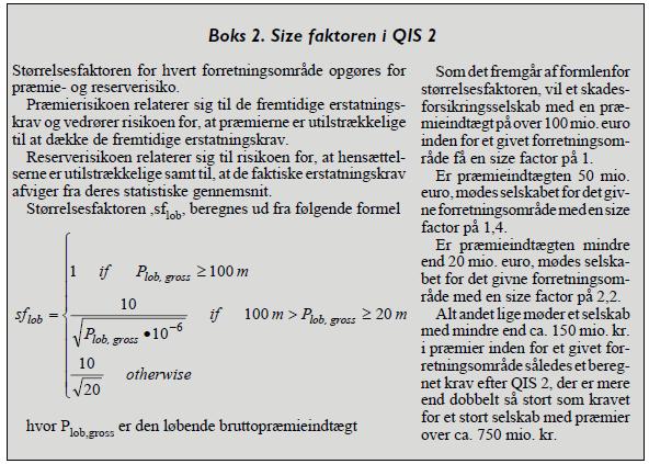 En væsentlig forklaring på de forøgede krav efter QIS 2 til mindre skadesforsikringsselskaber er den såkaldte „size factor“ – den er et udtryk for, at mindre selskaber er mere sårbare over for tilfældige udsving i forsikringsbegivenhederne, dvs. at risikoen mindskes, jo større et forsikringsselskab er. Meget tyder på, at denne størrelsesfaktor er fastsat noget arbitrært og må korrigeres i forbindelse med QIS 3, jf. boks 2.