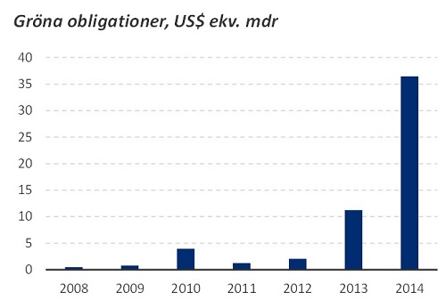 Figuren visar emitterad volym av gröna obligationer åren 2008 – 2014, baserat på en analys från Världsbanken. Källa: Världsbanken, What are Green Bonds