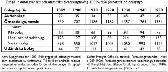 Nybildningen av ömsesidiga bolag mot slutet av 1800-talet bidrog till att ge det svenska försäkringsväsendet en fragmenterad struktur. Marknaden dominerades till antalet helt av regionala och lokala ömsesidiga bolag, men även antalet rikstäckande bolag var relativt stort. Någon genomgripande strukturell förändring skedde heller inte på den svenska försäkringsmarknaden under första hälften av 1900-talet (se tabell 1).