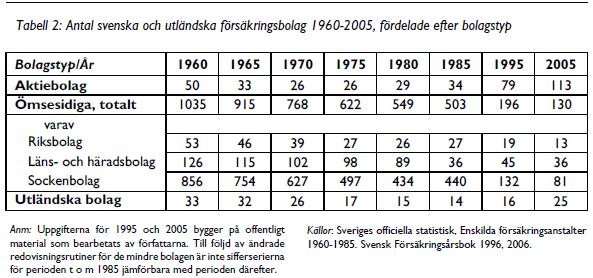 Den svenska försäkringsmarknaden har i dag en hög koncentrationsgrad, där ett fåtal koncerner dominerar marknaden. Denna koncentration inleddes på allvar i början på 1960-talet, då huvuddelen av aktiebolagen fusionerade och bildade koncernen Skandia (Englund, 1982). Samtidigt pågick en strukturomvandling bland de rikstäckande ömsesidiga bolagen som utmynnade i bildandet av Trygg-Hansa koncernen 1971. Även bland läns- och sockenbolagen fanns en tydlig tendens till sammangåenden (se tabell 2).
