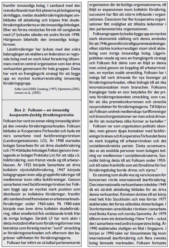 Den svenska försäkringsmarknaden har förändrats kraftigt de senaste två decennierna. Omvandlingen har berört såväl relationerna mellan bolagen, bolagens associationsformer och verksamhetens institutionella ramverk som relationen till staten. Ett generellt kännetecken för försäkringsmarknader är att de tilldragit sig statsmakternas intresse. Detta var särskilt tydligt i Sverige efter andra världskriget, då den statliga regleringen av försäkringsbranschen anpassades till den ekonomiska politiken. Under den svenska modellens storhetsperiod på 1950- och 60-talen eftersträvades en hög kontroll av de finansiella transaktionerna i landet. Syftet var att styra utvecklingen mot en rad samhällsekonomiska mål. Politiken innebar bland annat att konkurrensen på den svenska finansmarknaden begränsades kraftigt. I början på 1980-talet inleddes emellertid en omfattande avreglering som syftade till att effektivisera marknaden och anpassa svensk försäkring till den europeiska. Denna omvandlingsprocess befästes i och med att Sverige 1995 blev medlem av EU (Larsson et al., 2005).