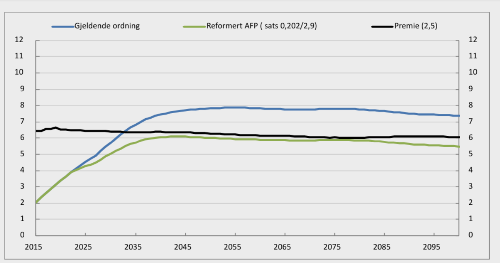 For det alternativet der satsen i gjeldende AFP-ordning videreføres, viser beregningene at premien må settes til 4,1 prosent forutsatt at det skal bygges opp fond til å dekke de juridiske forpliktelsene innen 2043, det vil si en økning på om lag 64 prosent.