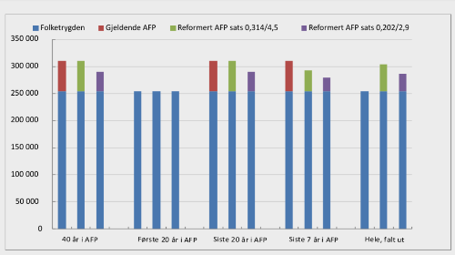 Begge figurene viser kun ytelse fra en privat reformert AFP. Hvis offentlig AFP legges om tilsvarende vil offentlig AFP for år i offentlig sektor komme i tillegg på søylene for reformert AFP (grønn og lilla), og bidra til høyere samlet ytelse. I dag vil en person kun få AFP enten fra offentlig eller privat AFP, gitt at de respektive vilkårene fylles.