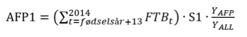 Overgangsordningen AFP1 vil være beregnet ut fra folketrygdens beregningsgrunnlag (FTB) i alle år t til og med 2014, multiplisert med en sats S1, samt forholdet mellom tiden (antall måneder) en har vært ansatt i AFP-bedrift fra og med 2015 (YAFP) og tiden (antall måneder) en maksimalt kunne ha vært ansatt i AFP-bedrift etter dette tidspunktet og fram til og med fylte 61 år (YALL).