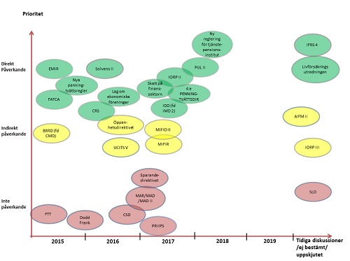 Vissa lagförslag, exempelvis Solvens 2 och IORP 2, får stor påverkan på ett försäkringsföretag/tjänstepensionsförening. Det är därför mycket viktigt för en compliance officer att hålla sig själv och företaget informerad om utvecklingen av förslaget och i vilket stadium i lagstiftningsprocessen det befinner sig10. Andra lagförslag kan vara mer perifera, men som en compliance officer ändå måste sätta sig in i och ha viss bevakning på. Antingen för att så småningom kunna bortse från regelverket, för att det inte påverkar företaget, eller för att det bedöms få en indirekt påverkan och därför måste beaktas framgent.