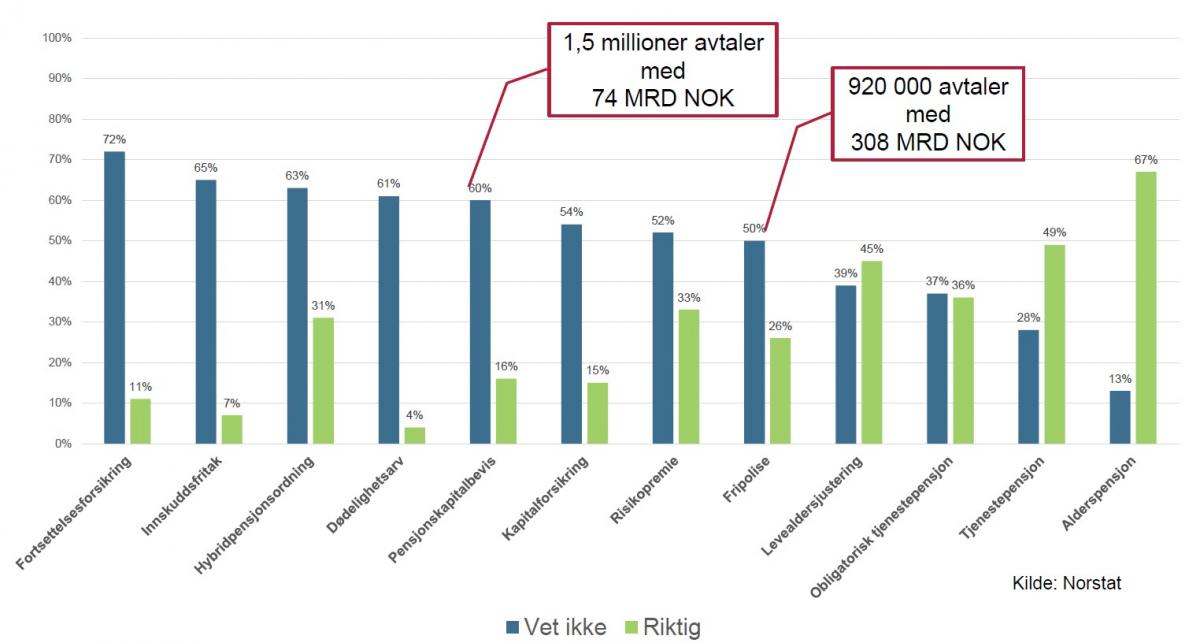 Det var god grunn til å gjøre noe med språket som ble brukt i kommunikasjon med forbrukerne på pensjonsområdet. «Aldri før har så mange skjønt så lite av noe som er viktig for dem», sa Finans Norges administrerende direktør etter at vi hadde gjennomført en undersøkelse av hva folk forsto av språket som ble brukt om pensjon. Undersøkelsen Finans Norge gjennomførte viste at folk flest – naturlig nok – ikke visste hva for eksempel fortsettelsesforsikring, innskuddsfritak, hybridpensjonsforsikring og dødelighetsarv var. Kanskje ikke så farlig, tenker du. Men det er betenkelig at bare 16 prosent av de spurte visste hva pensjonskapitalbevis var, når det foreligger 1,5 millioner avtaler om pensjonskapitalbevis, til en verdi av 74 milliarder kroner. Og nesten ikke til å tro at bare 26 prosent av de spurte visste hva fripolise var, selv om det forelå 920 000 avtaler om fripoliser, til en verdi av 308 milliarder kroner. Det er litt skremmende at så mye av pensjonen til det norske folk ligger pent innpakket i esker med merkelapper som så få forstår.